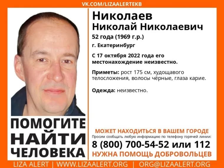 В Екатеринбурге полицейские совместно с поисково-спасательным отрядом «ЛизаАлерт» ищут пропавшего 52-летнего Николая Николаева. Об этом сообщили поисковики на своем официальном сайте.