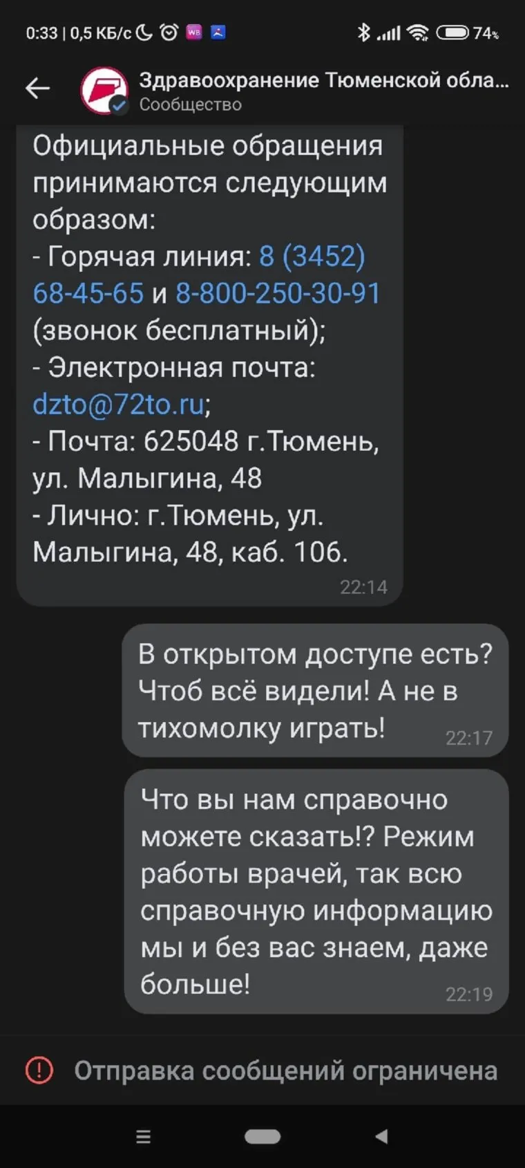 Департамент здравоохранения Тюменской области блокирует обращения граждан. Скрин