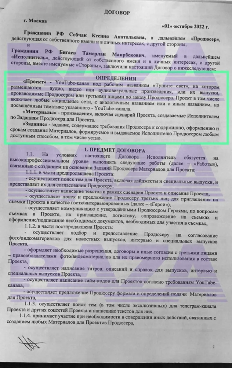 «Судя по тексту договора, заключенного 1 октября, именно продюсер (то есть Собчак) давала задания исполнителям (Бигаеву и другим админам „Тушите свет“). А они уже готовили материалы на основе ее заявок», — сообщает telegram-канал.