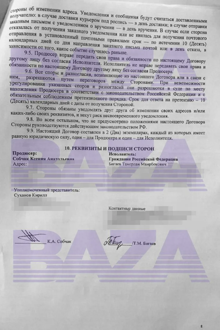 Интернет-издание Baza опубликовало договор журналистки Ксении Собчак с одним из администраторов telegram-канала «Тушите свет», подтверждающий ее причастность к вымогательствам у главы «Ростеха» Сергея Чемезова. Фотографии документа опубликованы в telegram-канале.