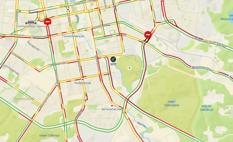 Дорожные заторы наблюдаются на Кольцовском тракте, по улице Белинского в сторону центра города, аналогичная ситуация сложилась на 8 марта, Машинной, Гурзуфской и на проспекте Ленина — от Восточной до главного корпуса Уральского федерального университета. С проблемой выезда столкнулись и жители района Академический.