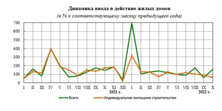 «Индивидуальными застройщиками введено 194,3 тыс. кв. метров общей площади жилых помещений. На долю индивидуального жилья в общем объеме жилищного строительства в январе—октябре 2022 г. приходилось 63,8% (в январе—октябре 2021 г. — 81,9%)», — указано в сообщении.