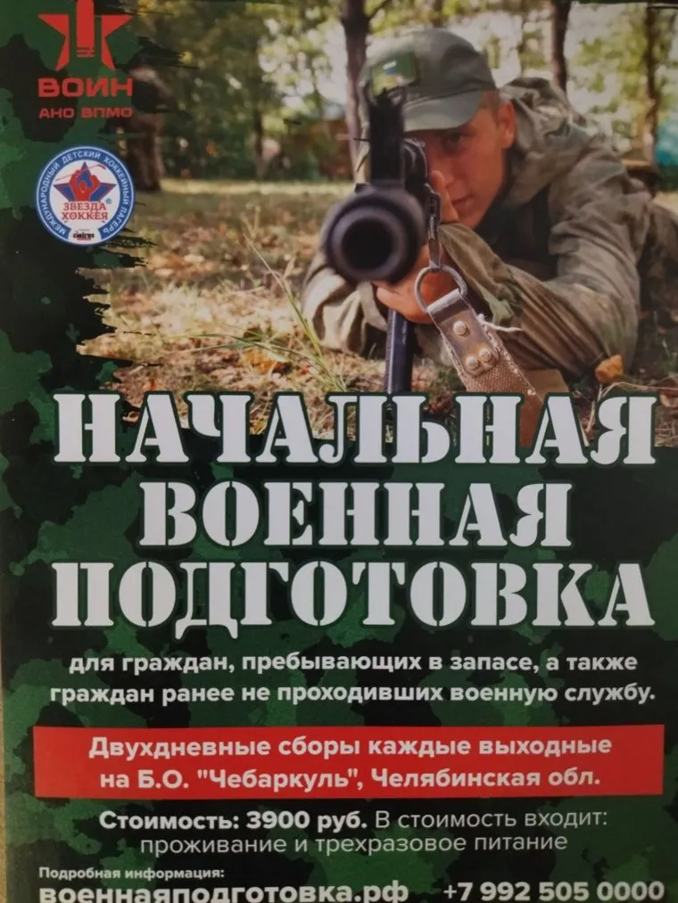 «Двухдневные военные сборы проходят каждые выходные на базе отдыха Чебаркуль от ВПМО «ВОИН» (входит в состав Международной Ассоциации ветеранов подразделения антитеррора «Альфа»). Начальная военная подготовка предназначена для граждан пребывающих в запасе, а также граждан, ранее не проходивших военную службу». Стоимость — от 3900 рублей», — говорится в объявлении.