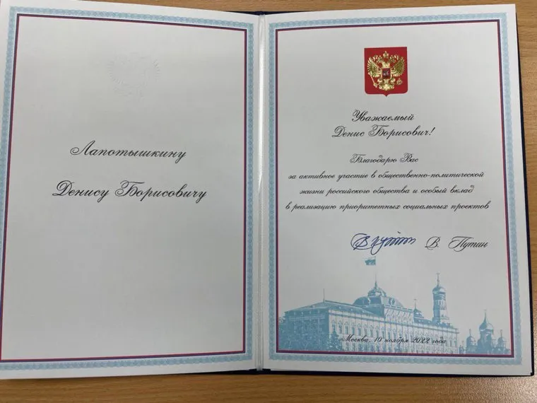 Двум жителям Челябинска вручили благодарственные письма за подписью президента России Владимира Путина, а на церемонии присутствовал первый заместитель руководителя администрации президента РФ Сергей Кириенко. Награды удостоились депутат гордумы Денис Лапотышкин и руководитель регионального штаба «Молодая Гвардия Единой России» Максим Голощапов. Об этом URA.RU 17 ноября сообщили в пресс-службе регионального МГЕР.