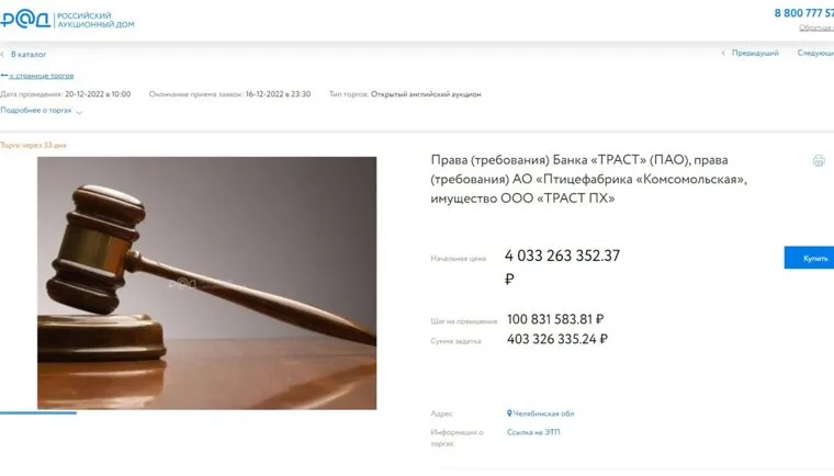 «Для покупки предлагаются права требования банка «Траст» , права требования АО «Птицефабрика «Комсомольская», имущество ООО «Траст ПХ» . Дата проведения торгов 20 декабря 2022 года», — сообщается на сайте «Российского аукционного дома».