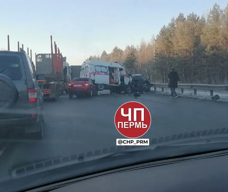 На трассе в Перском крае произошла авария с участием машины скорой помощи. Фотографии с места ДТП очевидцы опубликовали в telegram-канале «Пермь ЧП и ДТП, новости».