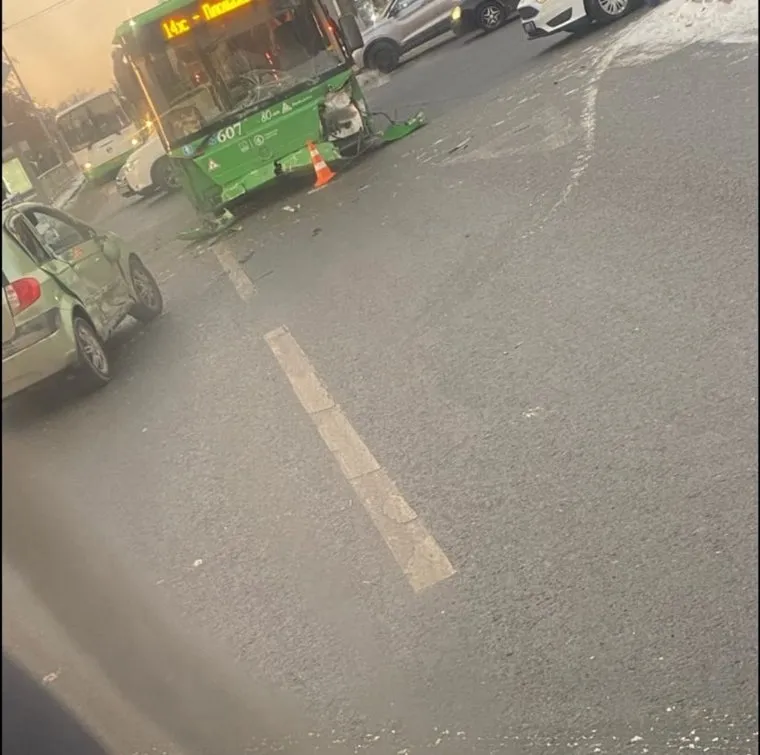 В центре Тюмени рейсовый автобус столкнулся с легковушкой. Фото