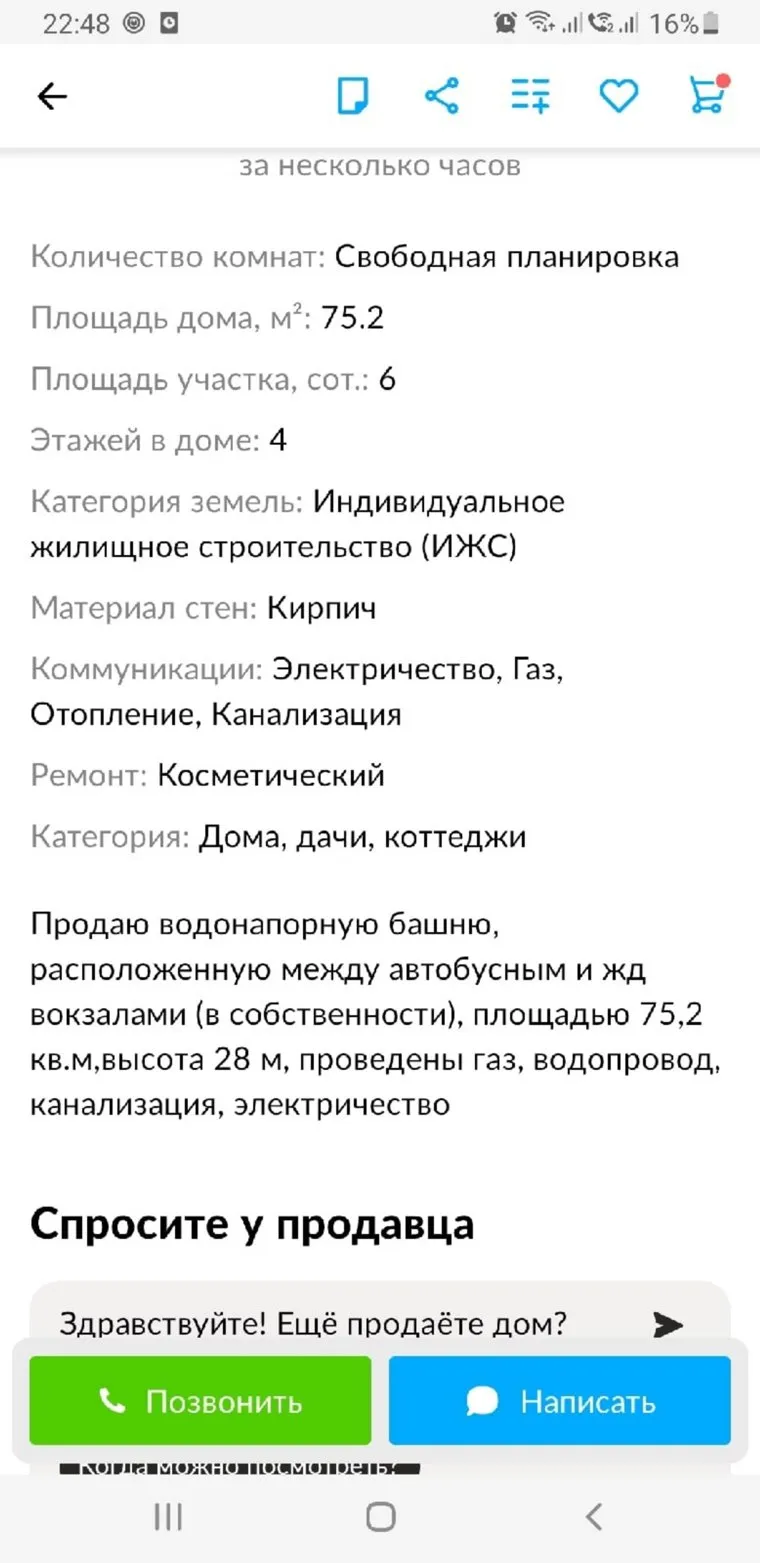 В описании объявления было сказано, что продается водонапорная башня, площадью 75,2 кв. м и высотой 28 м. Сообщается, что строение находится в частной собственности. В башне проведены газ, водопровод, канализация и электричество. Корреспонденту URA.RU не удалось получить комментарий продавца из-за того, что объявление было удалено.