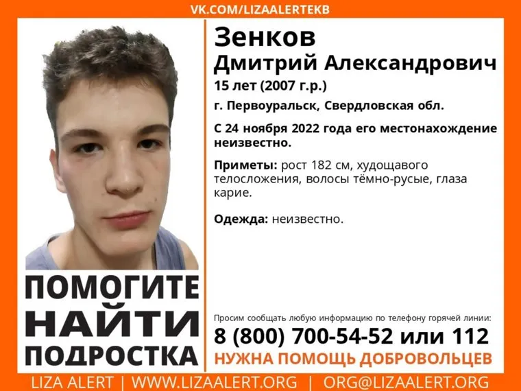 В Первоуральске (Свердловская область) пропал 15-летний Дмитрий Зенков. Родители занимаются поисками ребенка с 24 ноября. Об этом сообщает пресс-служба поискового отряда «ЛизаАлерт» в соцсети «ВКонтакте».