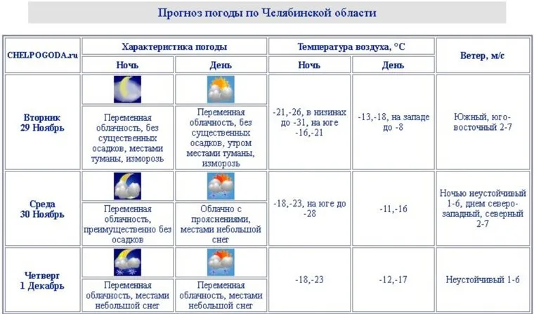 Погода в самом Челябинске 1 декабря не будет слишком отличаться от условий на территории остальной области с той лишь разницей, что осадков в столице региона не ожидается. Два предшествующих дня температура здесь также не достигнет 30-градусной отметки.
