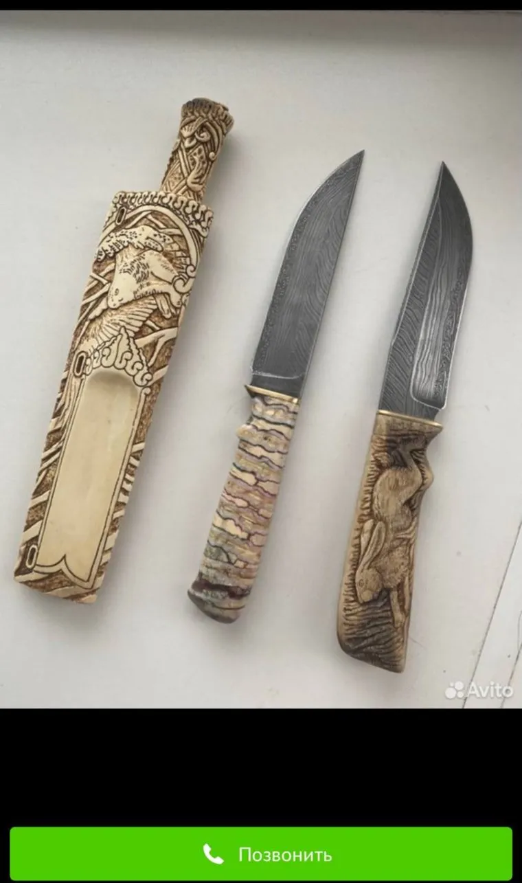 «Ножи ручной работы с бритвенной заточкой. Один нож выполнен из зуба мамонта, другой из рога оленя. Цена 100 тысяч рублей», — говорится в сообщении.