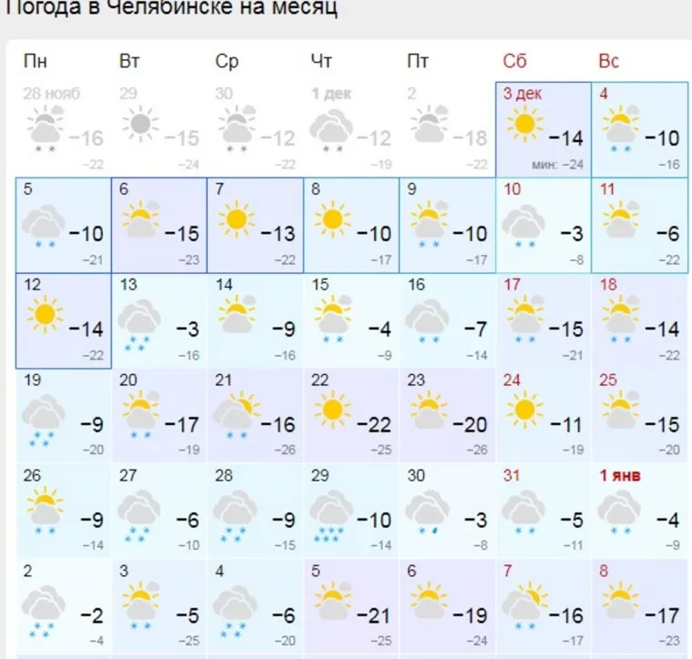 По прогнозу, всю неделю с 5 по 11 декабря ночные температуры будут держаться в районе -17…-22 градусов. Днем будет -10…-15 градусов. Потепление придет в регион с 13 декабря. Днем будет -3, ночью -16. К концу недели область вновь ждет похолодание до -15…-22 днем и -26 ночью.