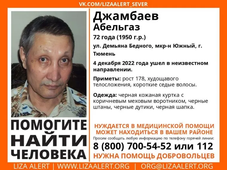 «Мужчина вышел из дома, расположенного по улице Демьяна Бедного, 4 декабря. Дальнейшее его местоположение неизвестно», — говорится в ориентировке.