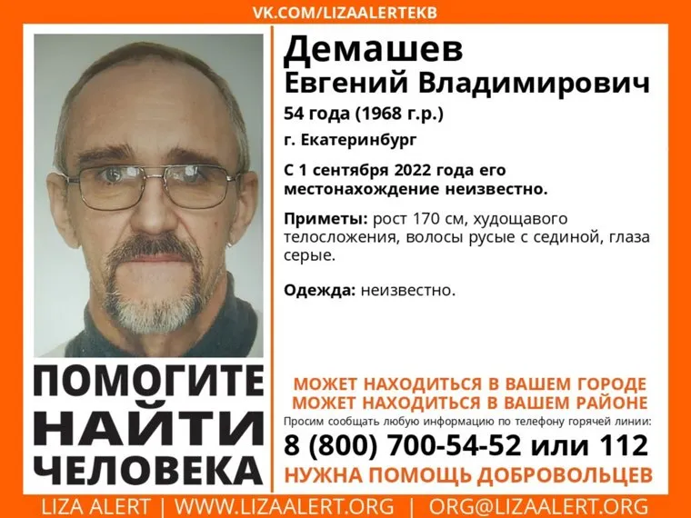 В Екатеринбурге полиция совместно с поисково-спасательным отрядом ищут 54-летнего Евгения Демашева, который не выходит на связь с 1 сентября. Об этом сообщают поисковики на сайте «ЛизаАлерт».