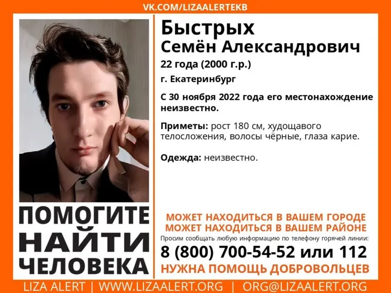 Поисково-спасательный отряд вместе с екатеринбургскими полицейскими ищут 22-летнего Семена Быстрых. Об этом сообщили поисковики «ЛизаАлерт» на официальном сайте.