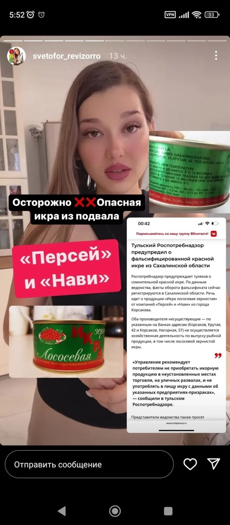 «Возможно кому-то пригодится информация, раз уже и у нас в городе появилась данная продукция», — сообщил пользователь. Житель опубликовал скрин, в котором говорится: «Осторожно, опасная икра из подвала». Также в скрине отмечено, что Тульский Роспотребнадзор предупреждает о фальсифицированной красной икре из Сахалина компаний «Персей» и «Нави».