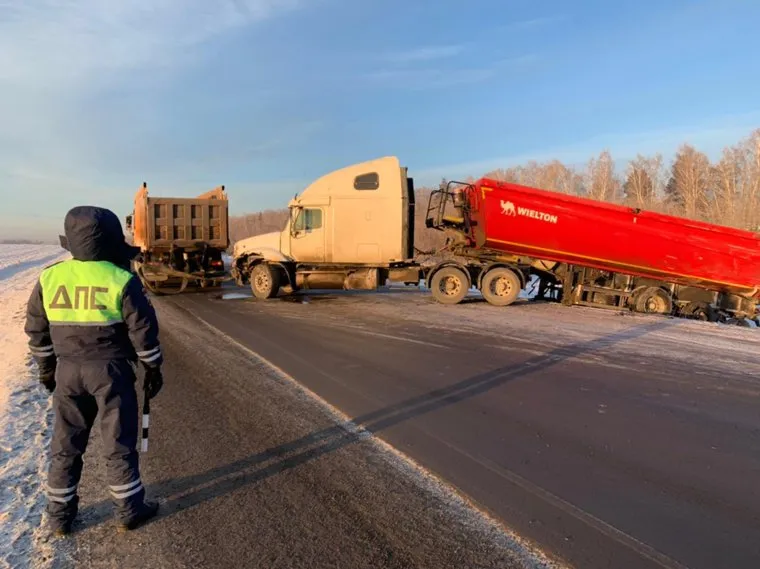 На трассе «Екатеринбург — Тюмень» водитель фуры разбился, влетев во встречный грузовик. Фото