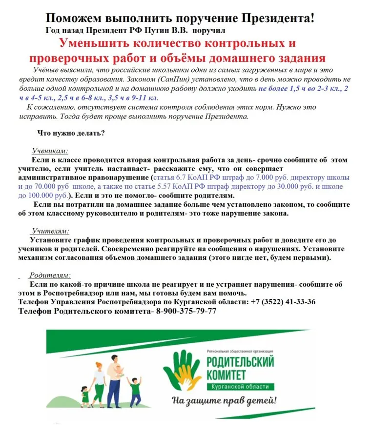 Родкомитет приводит установленные законом (СанПин) нагрузки для учеников. В день можно проводить не больше одной контрольной и на домашнюю работу должно уходить не более 1,5 ч во 2-3 кл., 2 ч в 4-5 кл., 2,5 ч в 6-8 кл., 3,5 ч в 9-11 кл. При наличии нарушений родителям рекомендуют жаловаться в Роспотребнадзор (+7 (3522) 41-33-36) или родительский комитет- (8-900-375-79-77). Учителей просят составить график контрольных и проверочных работ, а также ввести механизм согласования объемов домашнего задания.