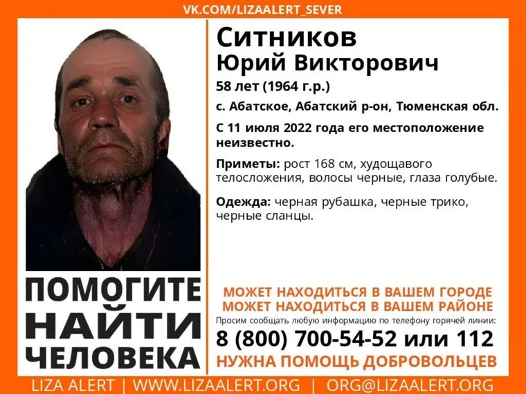 «Пропал Ситников Юрий, 58 лет. Село Абатское, Абатский район. С 11 июля 2022 года его местоположение неизвестно», — говорится в сообщении поисковиков.