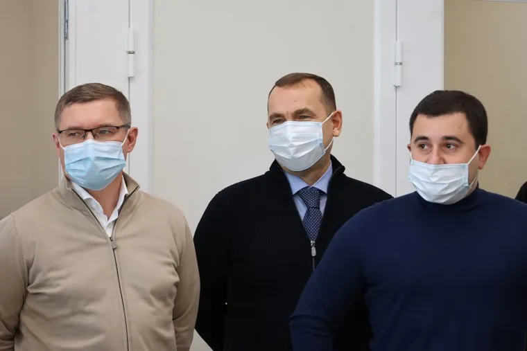(слева направо) полпред Якушев, губернатор Шумков и замминистра ЖКХ Стасишин осмотрели готовую детскую поликлинику в Заозерном