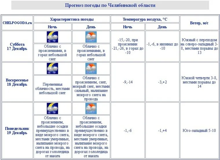 «Днем 18 декабря термометры в Челябинской области покажут до 2 градусов выше нуля. Небольшой снег, начавшийся накануне, в воскресенье местами резко усилится и начнет налипать на провода. Ситуация обострится 19 декабря: теплая ночь на понедельник (-1-6 градусов) сменится еще более теплым — до +4 градусов — днем. Все это время будет продолжаться мокрый снег, образуя накат и гололедицу на дорогах», — пояснили в челябинском ЦГМС.