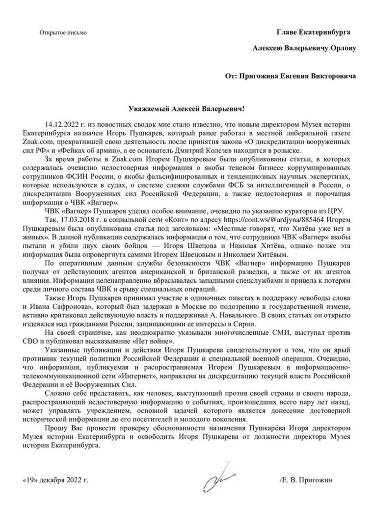 Новый директор Музея истории Екатеринбурга Игорь Пушкарев, когда работал журналистом издания Znak.com, получал информацию от зарубежных спецслужб, в частности ЦРУ, заявил бизнесмен и основатель ЧВК «Вагнер„Евгений Пригожин. Об этом он написал в письме на имя мэра Алексея Орлова. Обращение от 19 декабря в своих соцсетях распространила пресс-служба компании Пригожина ‚Конкорд‘.