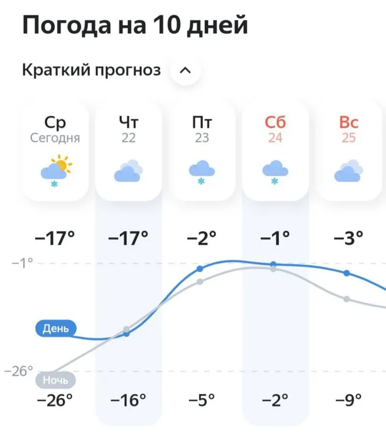 «Тюменская область. 21 декабря днем пасмурно, небольшой снег. Температура воздуха днем составит -19,-17 градусов, -26,-21 ночью. 22 декабря днем будет пасмурно, ночью небольшой снег. Температура воздуха днем -24,-21 градус, -16,-12 ночью. 23 декабря весь день будет идти снег. Температура воздуха днем -7,-3 градуса, -5,-2 ночью», — прогнозируют синоптики.