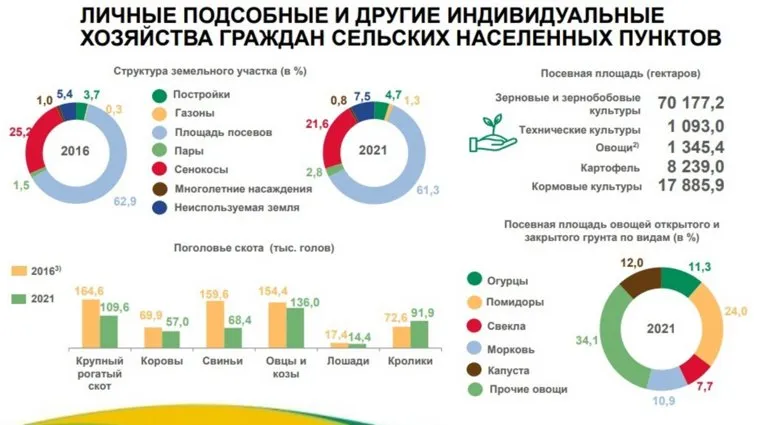 На долю помидоров приходится 24% засеянных площадей, на капусту 12%), на огурцы — 11,3%, на прочие культуры — 34,1%. Что касается личных приусадебных хозяйств, то жители региона в 2,3 раза сократили содержание свиней и нарастили поголовье кроликов.