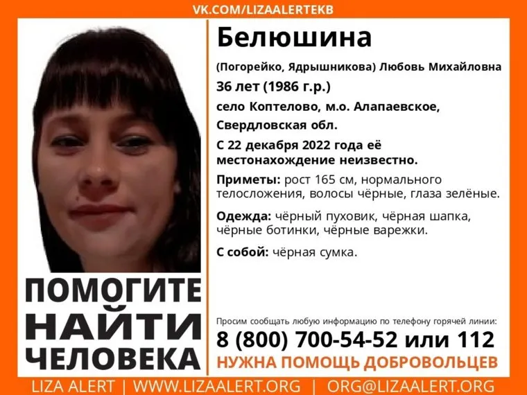 В селе Коптелово Свердловской области пропала 36-летняя Любовь Белюшина. Как сообщают волонтеры «ЛизаАлерт» в соцсети «ВКонтакте», девушка потерялась 22 декабря.