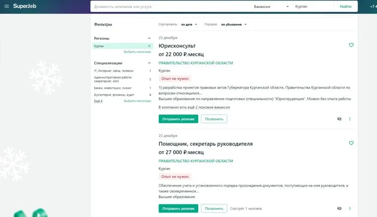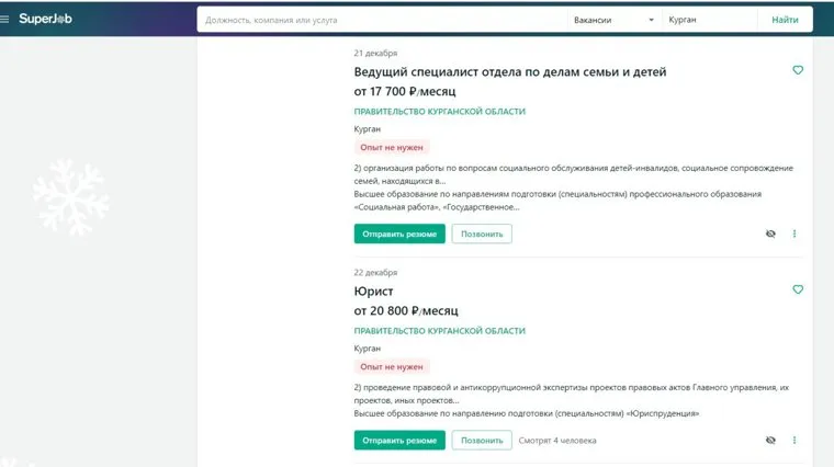 «Юрист. Опыт работы не требуется, высшее образование, полная занятость. Зарплата — от 20 800 в месяц. Обязанности: участие в разработке и разработка проектов нормативных правовых актов Курганской области; проведение правовой и антикоррупционной экспертиз проектов документов; подготовка ответов на запросы и обращения граждан, органов власти», — указано в одной из вакансии. Также опыт работы у кандидатов не требуется на должности секретаря руководителя, экономиста.