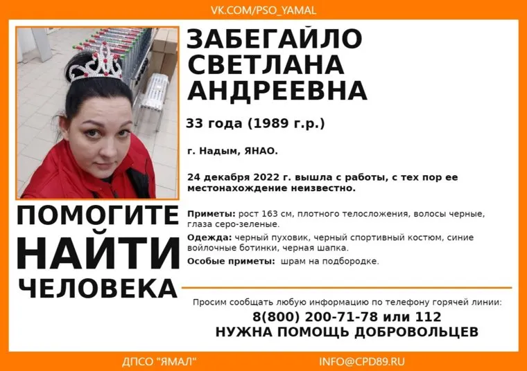 В Надыме (ЯНАО) волонтеры ищут пропавшую Светлану Забегайло. Женщина вышла с работы и пропала, сообщается в группе поисково-спасательного отряда «Ямал» в соцсети «ВКонтакте».
