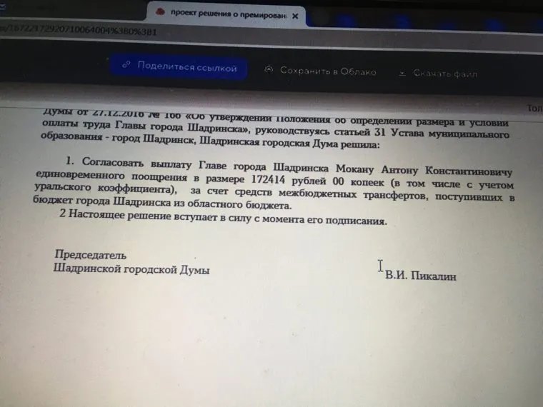 Городская дума Шадринска на внеочередном заседании приняла решение поощрить главу города Антона Мокана премией в 172 тысячи рублей. Об этом URA.RU рассказал депутат Александр Бухаров.