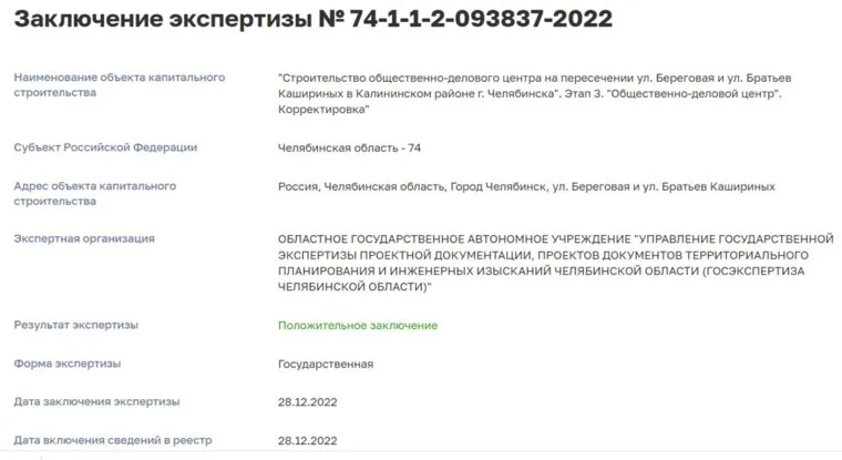«Одобрена проектная документация по строительству общественно-делового центра на пересечении улиц Береговая и Братьев Кашириных в Калининском районе города Челябинска. Этап 3. Положительное заключение», — говорится на сайте.