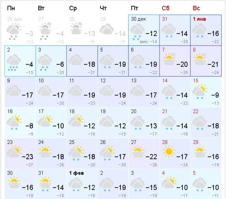 Несколько потеплеет с 16 по 21 января: от 8 до 14 градусов мороза днем и 9-16 ночью. В воскресенье, 22 января, начнется новое похолодание. Днем столбик термометра опустится до минус 18 градусов, а в ночь на 27 января до минус 27. В последующую неделю, до 29 декабря, ночи обещают быть столь же холодными. Не слишком комфортно будет на улице и днем — до минус 22 градусов.