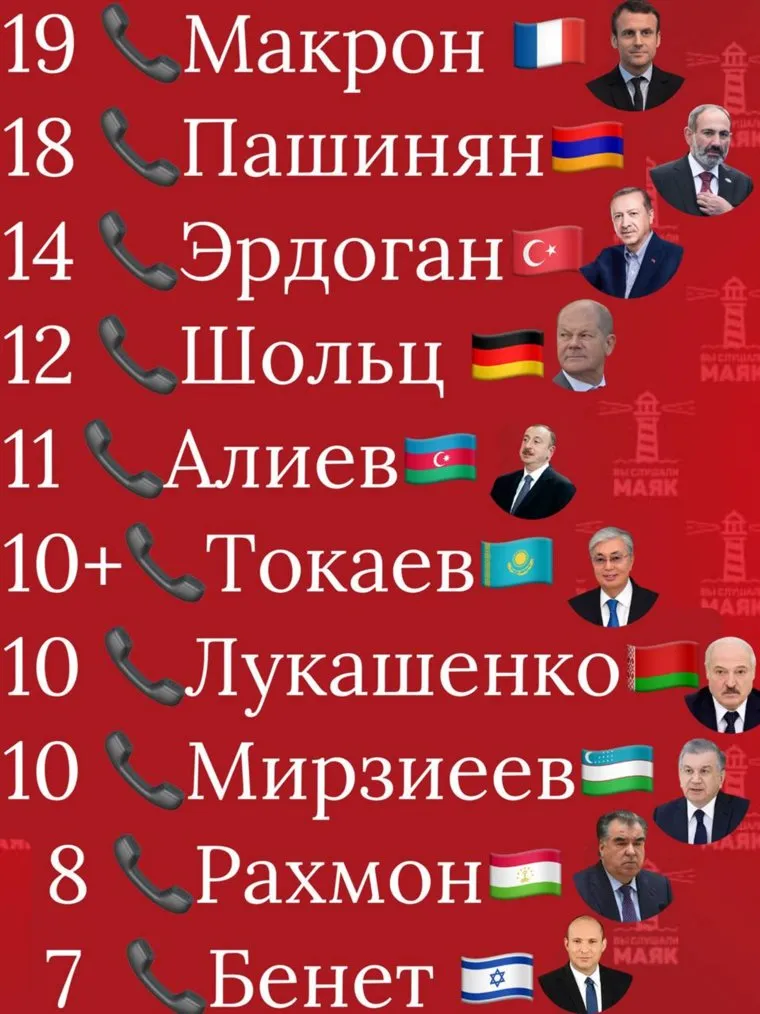 В топ-3 вошли премьер Армении Никол Пашинян и президент Турции Реджеп Эрдоган. Они звонили российскому лидеру 18 и 14 раз соответственно. На четвертом месте канцлер Германии Олаф Шольц — он звонил 12 раз.