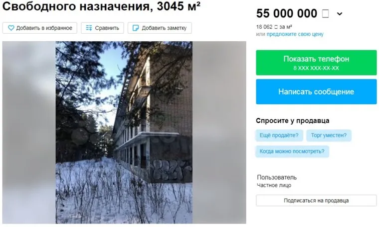 «Продам находящееся в экологически чистом сосновом бору здание профилактория „Сосна“ общей площадью 3045 кв. м. Три этажа + цоколь, под реконструкцию, конструктивные особенности и эксплуатационные свойства несущих стен сохранены», — говорится в объявлении на сайте «Авито».