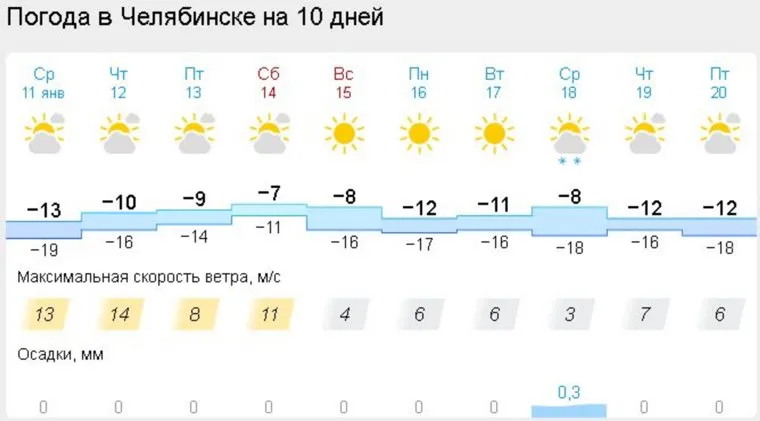 Дискомфорт будет представлять лишь сильный — до 8-11 метров в секунду ветер. Ожидается также переменная облачность. Схожая погода продержится на Южном Урале до конца недели . Снегопады возобновятся 18 и 19 января.