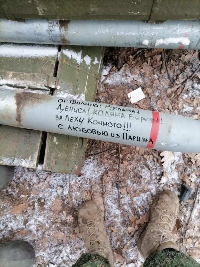 «От Филиппа, Руслана, Дениса, Коляна Березы за Леху Коннова. С любовью из Парижа», — написали бойцы на снарядах.
