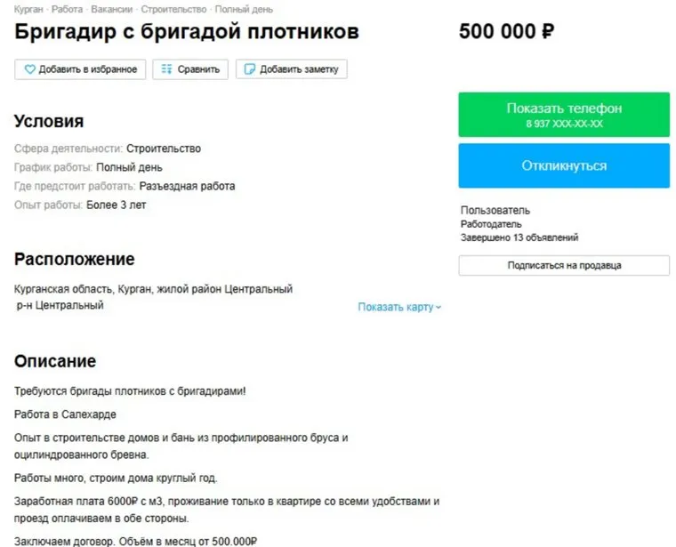 «Требуются бригады плотников с бригадирами. Работа в Салехарде. Опыт работы более трех лет. Обязанности: сборка домов и бань из профилированного бруса и оцилиндрованного бревна. Объем в месяц от 500 000 рублей», — указано в объявлении.