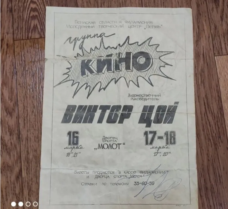 Пермяк за 150 тысяч рублей продает автограф основателя и лидера рок-группы «Кино» Виктора Цоя. Продавец рассказал URA.RU, что подпись музыканта подлинная. Цой расписался на афише во время концерта, с которым выступал в пермском дворце спорта «Молот».