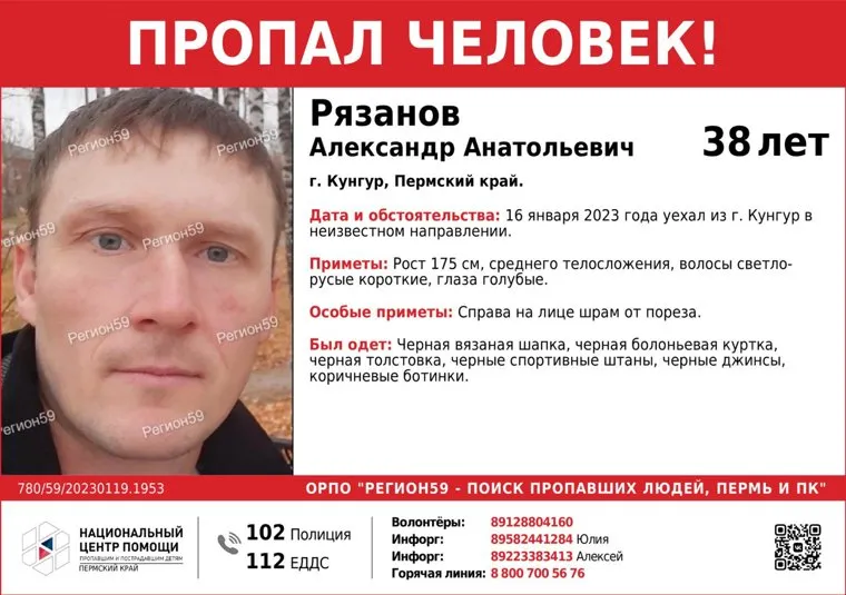 «Устанавливается местонахождение мужчины. 16 января 2023 года он уехал из г. Кунгур в неизвестном направлении. С тех пор его местонахождение неизвестно», — указано в сообщении. Всех, кто обладает какой-либо информацией, просят связаться с волонтерами или полицейскими.