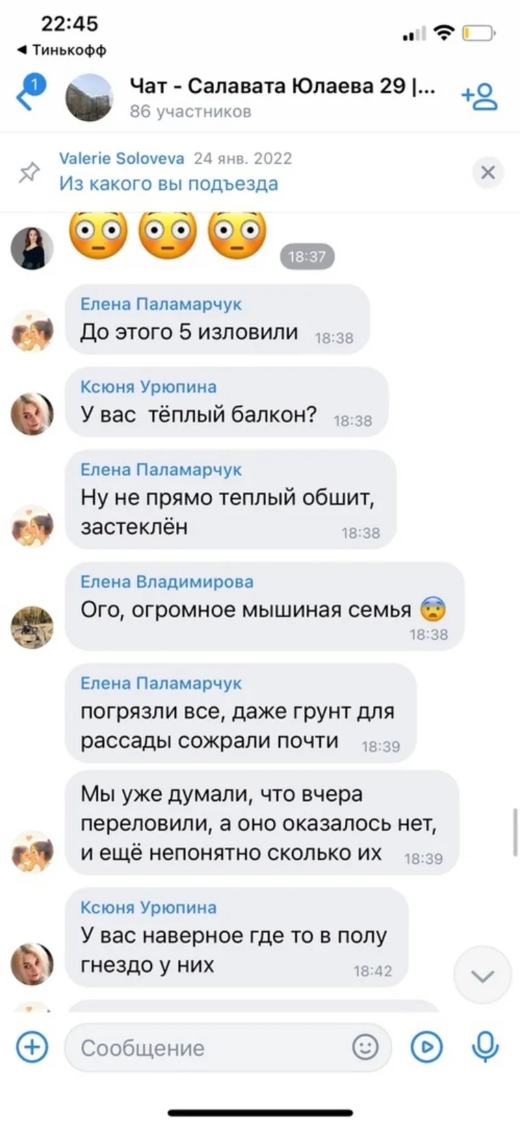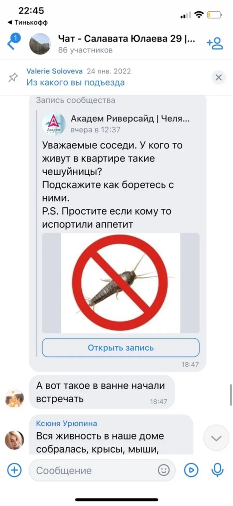 Елизавета С. поделилась скриншотами чата дома. Соседи автора поста подтвердили наличие грызунов и насекомых в квартирах. URA.RU обратилось за комментарием в управляющую компанию «Домоуправ — стандарт», там обещали ответить позже.