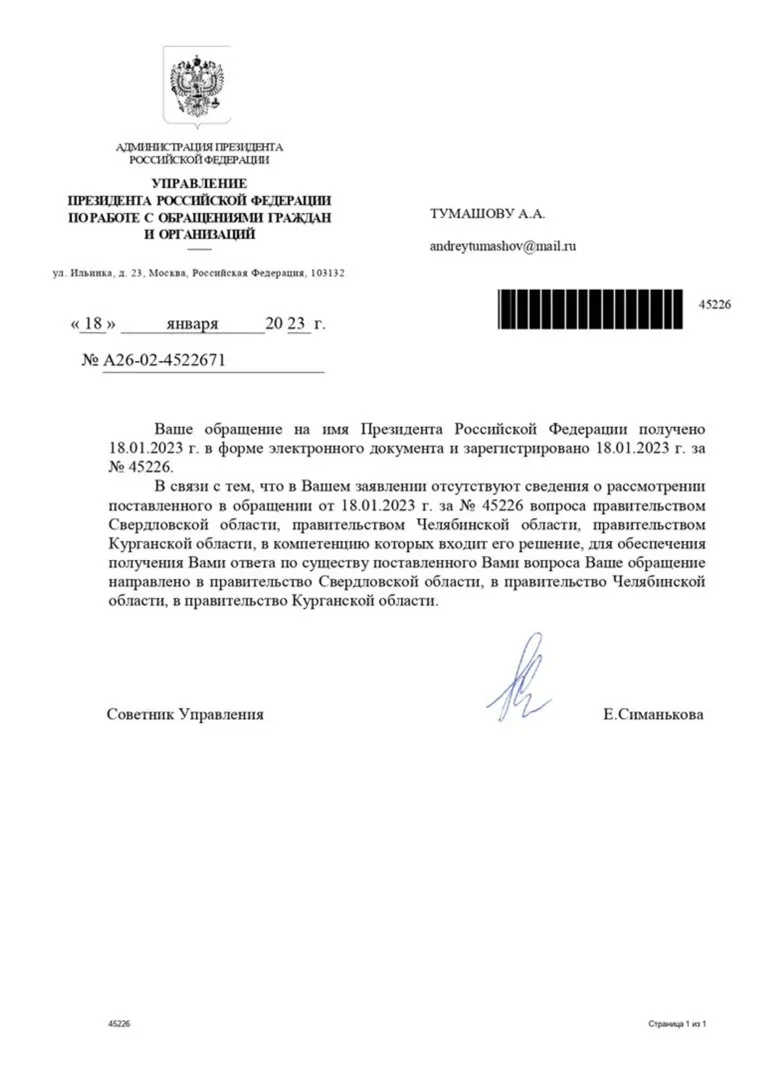 - Андрей Тумашов01 февраля 2023 21:43Мне пришли предварительные ответы о получении писем из администрации президента и готовности дать аргументированный ответ устами специалистов из Курганской и Челябинской областей, а сегодня позвонили из Минздрава Свердловской области. Все три ответа будут с подачи Правительств из местного Минздрава.