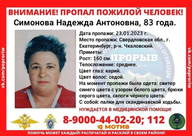 «Утром 23 января Симонова Надежда Антоновна вышла из больницы №24. Женщина ушла в неизвестном направлении. Пенсионерка страдает провалами в памяти. Она нуждается в медпомощи. Екатеринбурженка была одета в синий свитер, серые брюки и черные сапоги», — поделились информацией в «Прорыве».