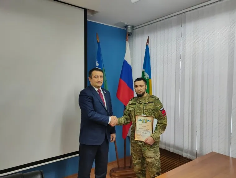 Доброволец из Пыть-Яха (ХМАО) Захид Меджидов получил благодарственное письмо от имени председателя Думы ХМАО Бориса Хохрякова за верность долгу и Отечеству на территориях Луганской и Донецкой народных республик. Награду добровольцу вручил депутат окружной Думы Халид Таги-заде.