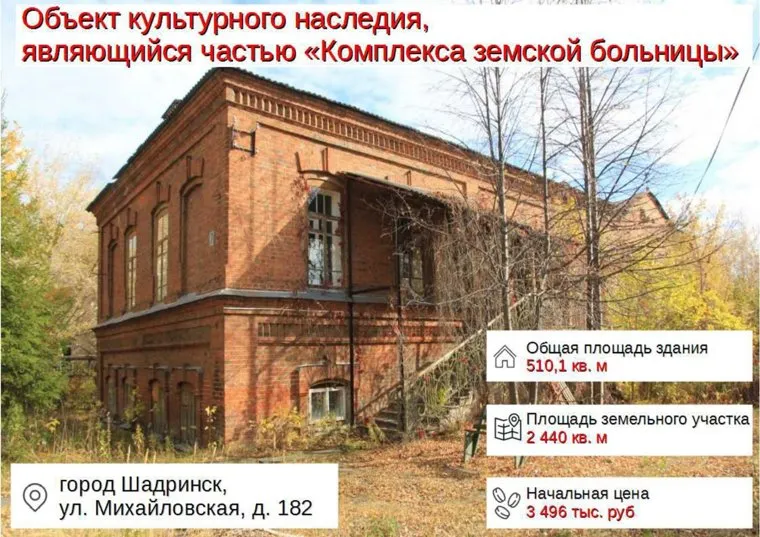 В городе Шадринск Курганской области продают здание комплекса земской больницы, которое является объектом культурного наследия. Информация о продаже размещена на сайте областного департамента имущественных и земельных отношений и других интернет-площадках.