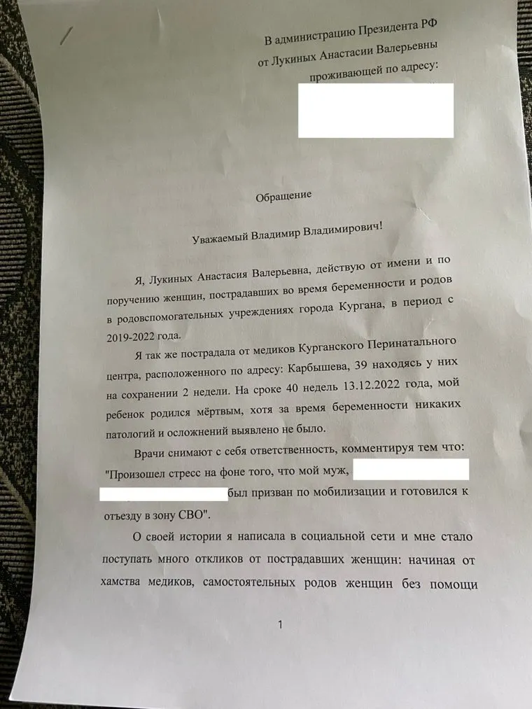 «Я действую от имени и по поручению женщин, пострадавших во время беременности и родов в родовспомогательных учреждениях города Кургана в период с 2019—2022 года. В настоящее время нас 25 человек и количество пострадавших растет: в созданном мной чате уже 36 женщин, их информацию я обрабатываю. Многим женщинам при обращении в правоохранительные органы было отказано в возбуждении уголовного дела. Мы боимся, что наши обращения останутся без внимания, а виновные окажутся безнаказанными, поэтому написали в администрацию президента», — рассказала Лукиных.