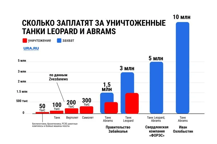 - Свердловская компания «ФОРЭС» объявила гонорар за уничтожение или захват танков, которые на Украину направили страны Запада. За каждый немецкий Leopard или американский Abrams можно получить по пять млн. рублей .