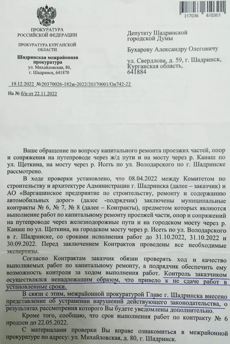 По запросу депутата Шадринская межрайонная прокуратура провела проверку по вопросу капитального ремонта путепровода через железнодорожные пути и моста через р. Канаш по ул. Щеткина, на мосту через р. Исеть по ул. Володарского в Шадринске. «Сроки исполнения работ: до 31 октября 2022 г., 31 октября 2022 года и 30 сентября 2022 г. соответственно. Согласно контрактам заказчик (комитет по строительству и архитектуре администрации Шадринска) обязан проверять ход и качество выполняемых работ», — указано в документе.