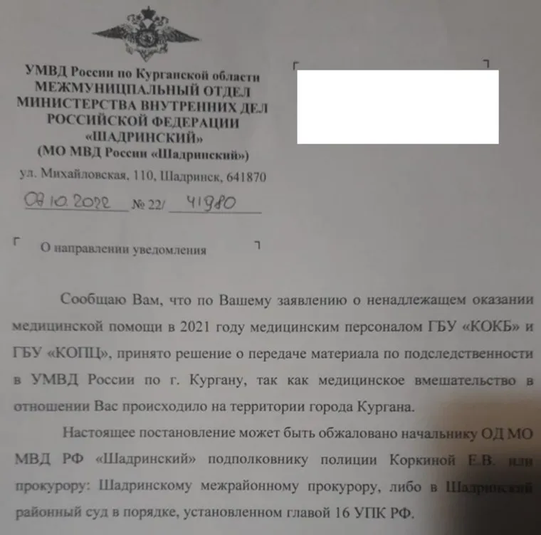 «Мы пытались получить информацию о ходе проверки по заявлению жительницы Шадринска, которой в 2021 году в период беременности в Кургане не выявили аппендицит, в результате чего ее здоровью был нанесен ущерб: часть органов удалена. Выяснили, что проверку проводил отдел полиции №2 Кургана, но материалы были переданы в СК, а затем обратно в ОП№2. На какой стадии проверка — не известно», — рассказал Андрюков.